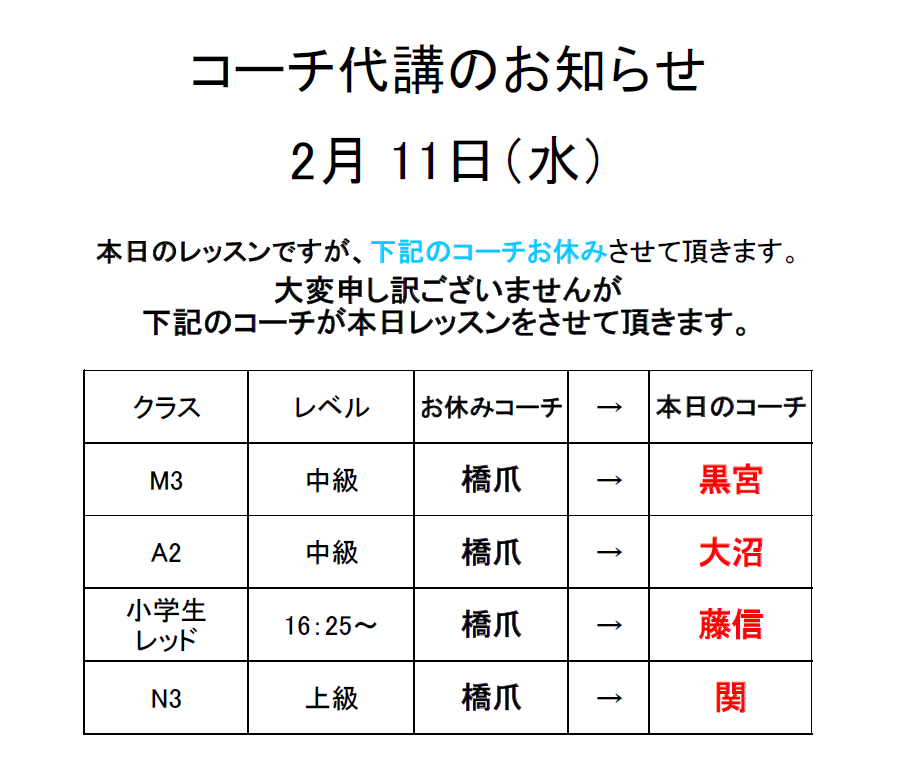 2月11日(水)コーチ代講のお知らせ