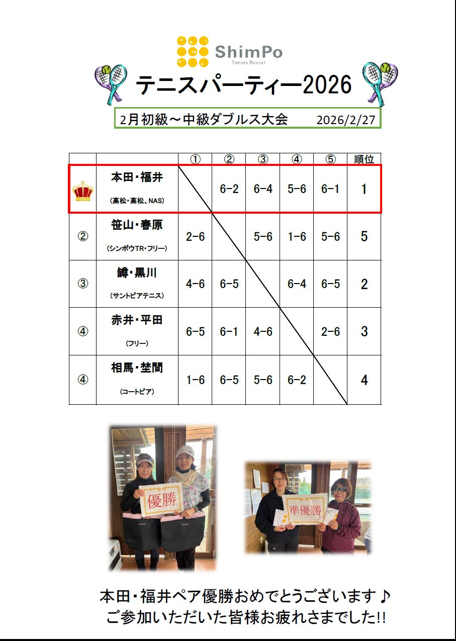 2026 月例女子初級~中級ダブルス2月大会